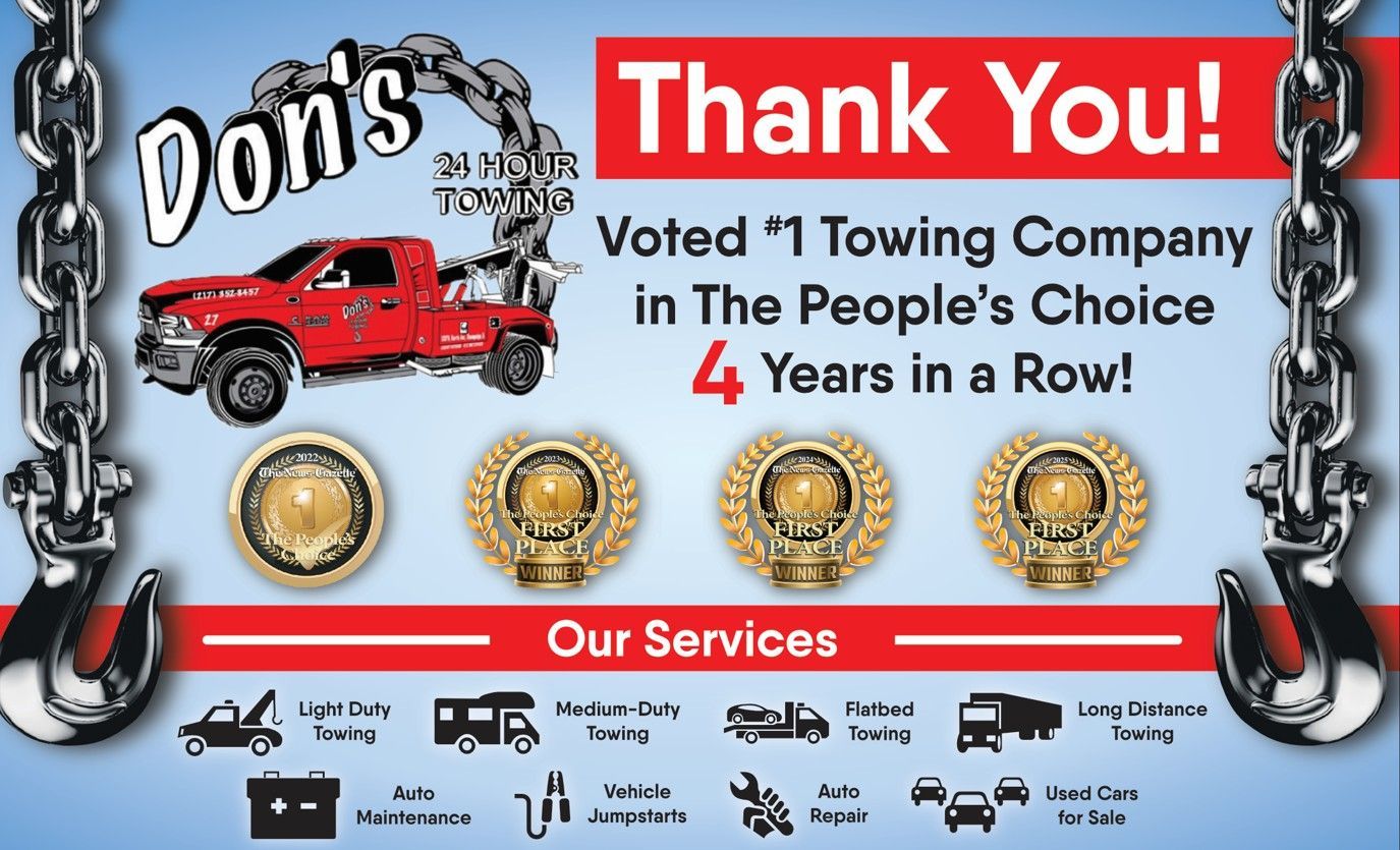 Don’s 24 Hour Towing has been serving the Champaign area for decades, providing reliable and professional towing and roadside assistance services.